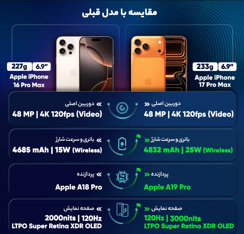 آیفون ۱۷ پرو مکس ترکیبی از طراحی دقیق، سختافزار قدرتمند و نرمافزار پیشرفته است که آن را به یکی از کاملترین تلفنهای هوشمند بازار تبدیل کرده است. بدنه آلومینیومی فورجشده، نمایشگر OLED با روشنایی ۳۰۰۰ نیت، پردازنده A19 Pro با توان پردازشی بالا، سیستم خنککننده Vapor Chamber و دوربینهای ۴۸ مگاپیکسلی همه نشان میدهند که اپل بار دیگر سطح انتظارات را بالا برده است. باتری بادوام، شارژ سریعتر، قابلیتهای نرمافزاری جدید مبتنی بر هوش مصنوعی و مقاومت بالا در برابر آب و گردوغبار، تجربهای کامل و همهجانبه را برای کاربر فراهم میکنند. آیفون ۱۷ پرو مکس نهتنها یک ابزار ارتباطی، بلکه نمادی از پیشرفت فناوری و ترکیب هنر طراحی با مهندسی پیشرفته است. این دستگاه برای کاربرانی ساخته شده که بهترینها را در هر زمینهای میخواهند و حاضرند تجربهای بیرقیب را در قالب یک گوشی هوشمند در اختیار داشته باشند.